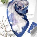 روسری نخ گارزا با زمینه شیری و گل های آبی یاسی بسیار ملیح زیبااست، قواره این روسری نخی گارزا ۱۳۵ است و دور دست دوز است.