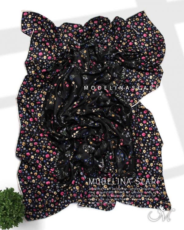 روسری نخی با طرح گل ریز فوق العاده و زمینه مشکی با کیفیت عالی و رنگ بسیار شیک.از ویژگی های این روسری براق بودن متریال و چاپ با کیفیت بر روی پارچه است. قواره این روسری 134 بوده و دور تا دور روسری دست دوز است. این روسری نخی اصلا لیز نیست و بر روی سر کاملا ایستایی دارد.