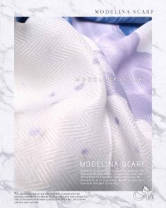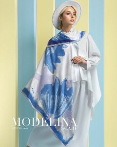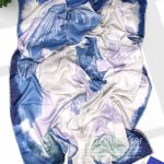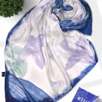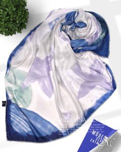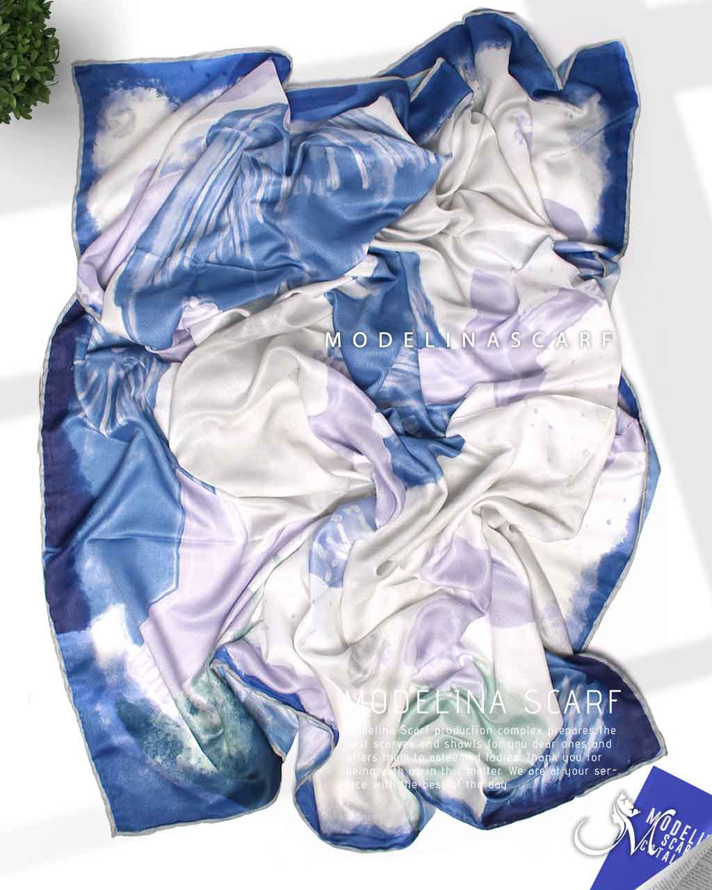 روسری نخ با زمینه شیری و گل های آبی یاسی بسیار ملیح زیبااست، از ویژگی های این روسری براق بودن متریال و چاپ با کیفیت بر روی پارچه است. قواره این روسری 134 بوده و دور تا دور روسری دست دوز است. این روسری نخی اصلا لیز نیست و بر روی سر کاملا ایستایی دارد..