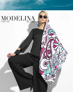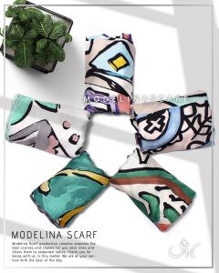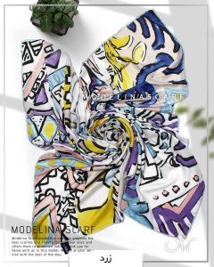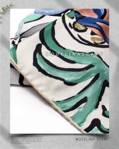 روسری نخی مدلینا با طرح خاص تاش قلمو بسیار زیبا و در رنگبندی شاد. قواره این روسری ۱۳۵ است. دور تا دور روسری دست دوز است. جنس این روسری نخی بوده و بسیار سبک و لطیف است. این روسری روی سر کمی شاین دارد و اصلاً سُر نیست.