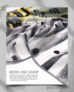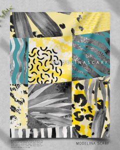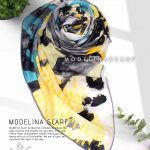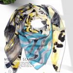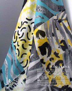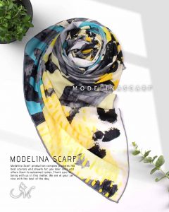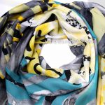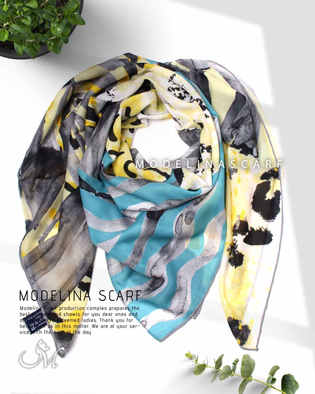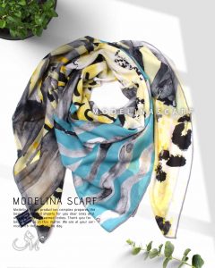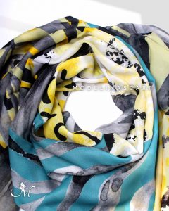 روسری طرح مدیترانه ای با رنگ بندی طوسی، سبز-آبی و زرد بسیار خاص و چشم نواز .قواره این روسری نخی گارزا ۱۳۵ است و دور دست دوز است.