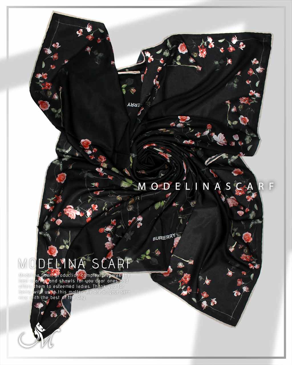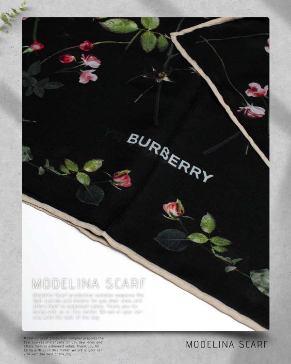 روسری بربری با زمینه مشکی و رزهای صورتی ملیح بسیار زیبا و دلنواز است، قواره این روسری نخی گارزا ۱۳۵ است و طرح این روسری بر اساس آرین ژورنال برند باربری است.