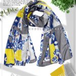 شال طرح دار نخی زمینه طوسی و سرمه لی با طراحی لویی ویتون LV می باشد. اگر به دنبال یک شال با ست خور راحت برای استفاده روزمره هستید، این شال گزینه مناسبی برای شما می باشد.شال نخی بهاره بسیار سبک و راحت است که برای فصول گرم سال بسیار خنک و عالی است..اصلاً سر نیست و ایستایی بالایی دارد